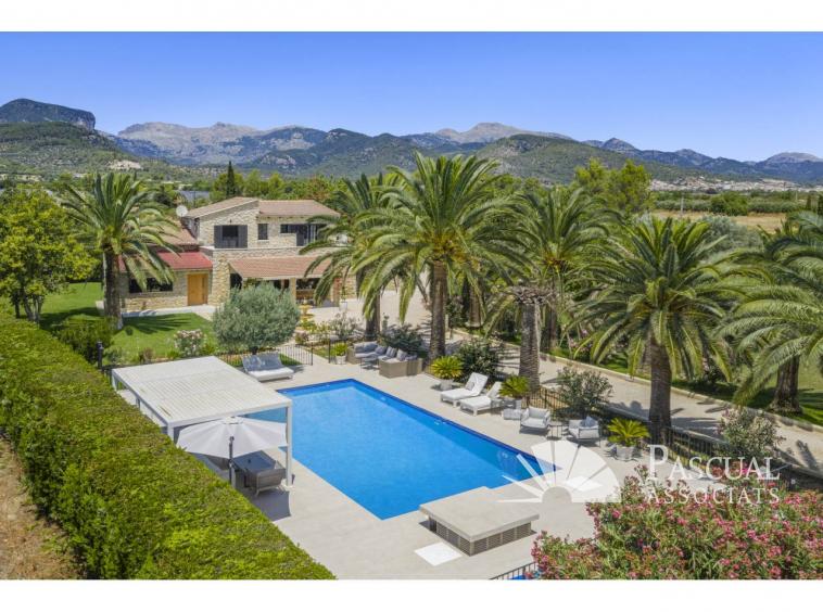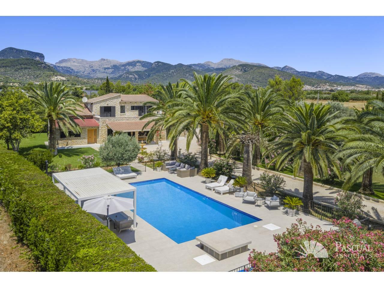 Auf einem flachen, von der Sonne verwöhnten Grundstück von 8.300 m² gelegen, kombiniert dieses vollständig renovierte Anwesen perfekt den authentischen mallorquinischen Charme mit modernem Komfort. Das Anwesen umfasst zwei exquisit gestaltete Gästehäuser, einen Salzwasserpool, Solarenergie und spektakuläre Ausblicke auf die Tramuntana.